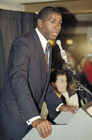 接着,魔术师冷静地发表了NBA史上最为震撼的公告——“由于纵欲和滥用药物,我被查处感染了HIV病毒,即引发艾滋病的致命病毒,为此,我选择退役。”
