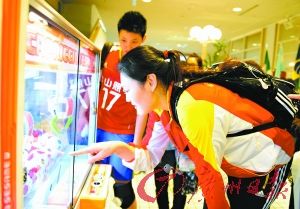 赛场边还有游戏机,许多VABO-CHAN公仔堆放在一个透明塑料箱里,只要投入300日元,便可以通过控制按钮夹三次。这种VABO-CHAN原价500日元,如果是个游戏高手,夹三次就能成功钓上一个。今天比赛结束后20分钟,王一梅(微博)兴高采烈地重新回到了赛场内,原来她是来找相熟的记者“炫耀”战利品的。“300日元一次,我和张磊玩了4次,夹到3个啦。”正在一旁接受采访的中国女排教练胡进表扬了大梅:“不错嘛,原价500日元一个呢,大梅你赚了。”这句表扬让大梅更开心了,她拉着刚刚进来的张磊说,“走,再去夹一个。”两人凑了3个100日元的钢镚之后,手牵着手几乎是蹦蹦跳跳地来到了游戏机跟前。两人一直在研究“垂钓”的技巧,专注得根本不知道主教练俞觉敏已经到了身后。看着两名童心未泯的爱徒,老俞笑了……王一梅和张磊的中国女排战袍实在太显眼,没过一会儿,不少球迷围了过来,他们纷纷拿出手机拍下两人玩游戏的神态,更有球迷赞美王一梅“卡哇伊”……
