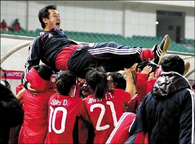 如愿进军女足世少赛,姑娘们兴奋地把范学伟(微博)抛了起来。图/Osports