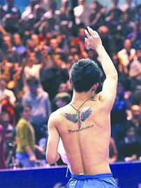 赛后,张继科脱衣庆祝,他背上的文身就像一对天使的翅膀,绚烂又夺目。