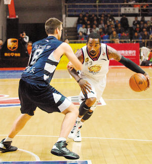 | 11月22日,浙江稠州银行队球员史密斯(右)在比赛中带球突破。当日,在2011-2012赛季CBA联赛第二轮比赛中,浙江稠州银行队主场以101比73战胜东莞马可波罗队。(新 华) |