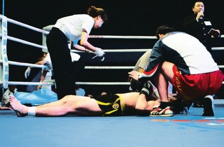 武管中心副主任、抢救前线总指挥王玉龙介绍:“10月31日晚进行的散打王比赛80公斤半决赛,崔飞对上官鹏飞,第二回合崔飞用组合拳击倒了上官鹏飞,裁判即刻终止了比赛,现场比赛监督和120现场立刻组织进行了抢救,并在大会组织者和教练员的帮助下,将上官鹏飞送往海口市人民医院进行急救。”