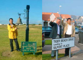 宋鑛满在上海。听副总方居正、迟守伟提起此事,他吩咐他们联系卡努斯蒂球会。后来,对方专程访问海阳旭宝,促成了双方结为姐妹球场的佳话。至今在卡努斯蒂所在的安格市,不仅有一条路是以“旭宝”命名的,而且还有一条路,是以“老虎滩高尔夫林克斯”命名的——Tiger Beach Golf Links是海阳旭宝的英文名字。一个知名老球会与一个远在中国的新球场结缘就是一个破例,换个地方,简直难以设想。