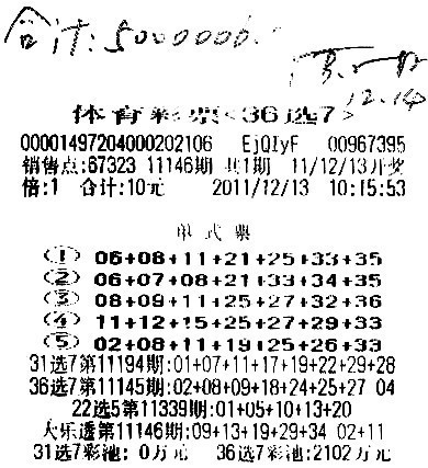 12月12日晚开奖的36选7第11146期中,再度爆出令福建彩民怦然心动的500万元超级特等奖,由莆田彩民拿下,中奖旺站位于莆田市秀屿区笏石镇北埔新街大众路341号67323站。中奖的是一张5注10元单式票,中奖者姓苏,是位85后的小伙。