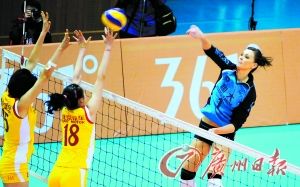 外援的稳定发挥是广东女排获胜的关键,图为波兰外援斯科沃隆斯卡扣球。 |