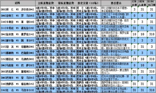 本期周日胜负彩的组合为传统的德甲(微博)+意甲+西甲(微博)的组合,观察对阵形势,可以发现本期的竞猜难度不小,有不少强强对话(微博)。四个让球超过一球的比赛,巴萨(微博)和皇马(微博)都是在客场作战,而拜仁(微博)对阵沙尔克并没有绝对优势,卡塔尼也不是稳胜对手,所以本期的稳胆的可信度有多少值得怀疑。此外近期有不少的球队状态都出现大问题,例如拉齐奥、国米(微博)、乌迪内等等,这些球队能否及时反弹也是本期需要注意的地方。