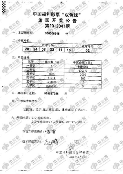 北京时间2012年04月10日晚,中国福利彩票(微博)双色球(微博)第2012041期开奖,当期开出的奖号为:红球08 11 15 20 24 32,蓝球02 。一等奖开出6注,每注奖金约为868万;二等奖开出77注,每注奖金约为43万。全国投注总额3.56亿,计奖结束后,奖池余额上升至5.28亿。
