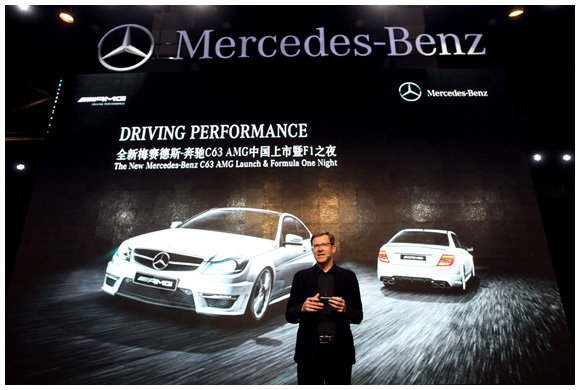 【2012年4月14日,上海】 2012世界一级方程式赛车中国大奖赛决赛前夜,座落于申城黄浦江畔的上海世博园区案例馆熠熠生辉。在充满激情与速度感的现场气氛中,梅赛德斯-奔驰(中国)汽车销售有限公司总裁兼首席执行官麦尔斯先生、销售与市场营销执行副总裁郝博先生、梅赛德斯-奔驰赛车运动部副总裁罗伯特•豪格先生以及众多嘉宾共同见证了Mercedes-AMG品牌45周年庆典暨全新梅赛德斯-奔驰C63 AMG中国上市活动。当晚,C63 AMG 双门轿跑车和新一代C63 AMG轿车震撼发布。