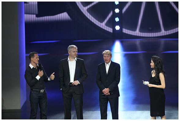 从左至右:迈克尔・舒马赫、郝博、米卡・哈基宁、主持人周瑛琦。