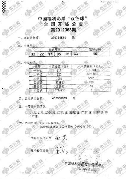 北京时间2012年06月12日晚,中国福利彩票(微博)双色球(微博)第2012068期开奖,红球奖号:05、17、22、26、32、33;蓝球10。一等奖井喷117注,每注奖金约为518万元。其中北京1彩民独揽110注,中奖站点为三里屯南路18号105882号投注站,他或将获得570016040元巨奖,成为新的中国彩票第一巨奖!本期二等奖开出120注,每注奖金约为26万元,广东揽35注。全国投注总额为3.79亿,计奖结束后,奖池余额狂降至4.62亿。[讨论:中国第一巨奖开出,您现在心情如何?][你也想买双色球中个5亿?请猛击这里!][现在新用户冲20送10块]