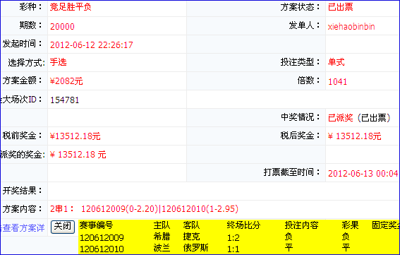 再看用户[xiehaobinbin]专攻欧洲杯单式倍投单。希腊VS捷克单挑负,波兰VS俄罗斯单挑平,技艺之高超无需赘言。1041倍2082元重锤之下,13512.18元手到擒来,成功创收11430.18元,豪气干云。