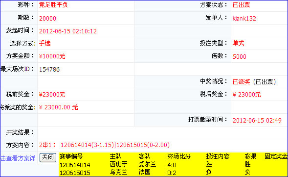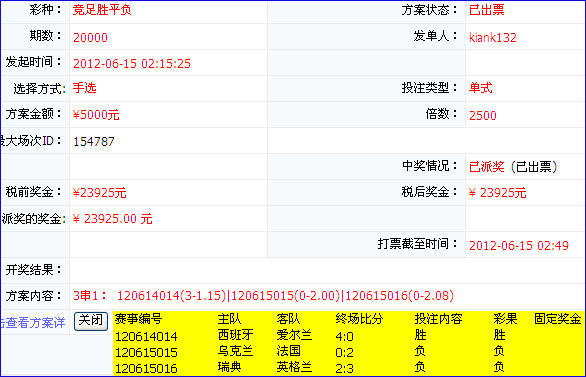 用户[kiank132]显然是一位做事懂得变通、不拘泥于常规的人。在普天彩民大都只玩当日赛事的大环境下,他则是把昨天的超级大稳胆西班牙与今日的两场比赛进行串关倍投。重砸2500倍,以5000元的投入力擒23925元。也许会有彩民发出质疑声,认为西班牙SP值太低没什么意义。小编来给大家做个计算,如果该方案去掉西班牙一场,只玩2串1,那么同等投入下,奖金=23925/1.15=20804,足足少了3120元!这能说没有意义吗?我看是很有意义吧。此外,西班牙这场是个另类,毕竟不是所有的稳胆SP值都这么低吧,假设你认准了今天乌克兰VS法国一场是稳胆,然后用该场比赛与明天的两场欧洲杯比赛进行串关倍投,那奖金的总额在同等情况下增幅无疑更大。足见此种跨比赛日的串关思路是非常值得推广的。毕竟“千金易得,稳胆难求”,一旦哪天遇上了稳胆,可千万不能错过机会,一定要想办法把稳胆的功效发挥到最大。此时跨比赛日串关无疑是一个极好的法子。可喜的是,2012欧洲杯激情上演之际竞彩足球就为您提供了此销魂投注方法成功操作的可能。您还等什么呢?