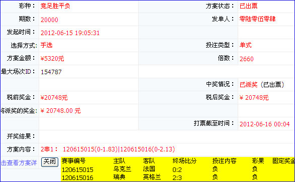 该用户依然是最近“最炫民族风”的典型代表,独玩当日欧洲杯的两场比赛。而由于乌克兰有东道主题材,另一场英格兰面对的又是克星,两场比赛虽然赛果正路,SP值却也不低。该用户细心研究之下,认准正路,果断倍投2660倍,5320元的投入换回20748元,净利润15428元。恭喜恭喜!看来“最炫民族风”成为欧洲杯期间彩民投注主流,果然有其道理,每日数也数不清的红单便是最好的证明。如今2012欧洲杯已经战罢16场,已然过半,彩民朋友千万不要再错过中奖良机。