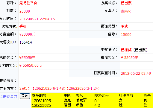 再看用户duyyx,认准2串1倍投之道,狂投葡萄牙、德国赢球15000倍,力擒55050元!
