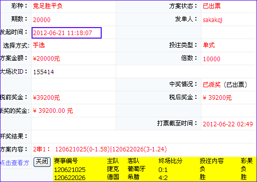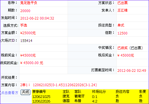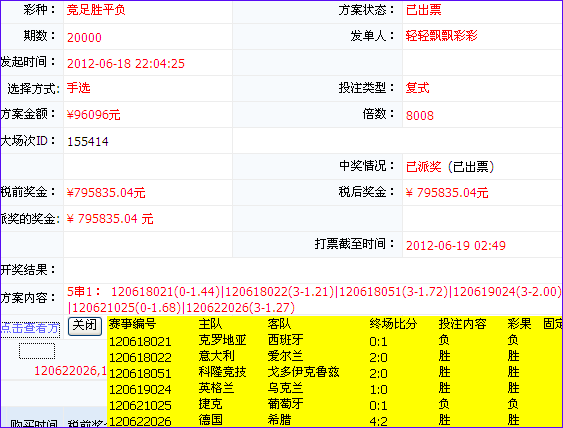 北京时间23日凌晨,随着德国战车4-2屠杀希腊,紧随葡萄牙杀入2012欧洲杯四强。本站多位重砸该两场比赛2串1的用户终于可以轻轻松松、开开心心的坐收大奖。而其中近来中奖势头极其恐怖的用户轻轻飘飘以一张倍投8008倍的5串1容错单狂揽79万,气场之强大让人瞠目结舌!
