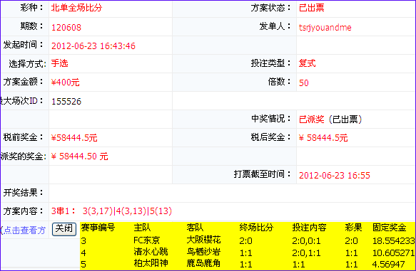 tsrjyouandme的中奖方案选择三场日职比赛进行串关,显然其对于日职有着极高的造诣。而其FC东京VS大阪樱花复选2:0、0:1;清水心跳复选2:0、1:1;柏太阳神VS鹿岛鹿角更是单挑1:1,眼光之犀利,技术之高超更是让人叹服!不管怎样58444元的奖金让其赚的盆满钵满的同时,也让其以26353元的巨大优势力压另一传奇人物第三名的周景德 (战绩