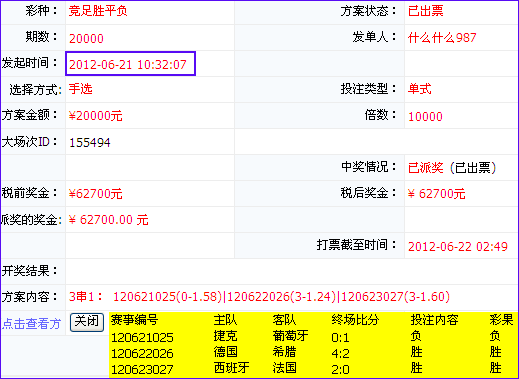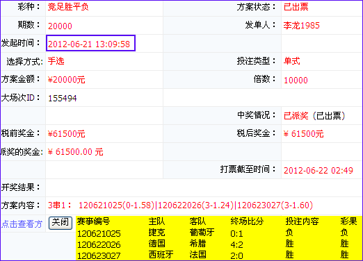 细心的彩民应该已经发现,李龙1985、什么什么987两位用户虽然单子一模一样,但是奖金却相差了1200元,这是由于什么什么987先于李龙1985两个半小时下注的缘故,出票SP值略微高一点,看来赚钱还真是要趁早(中奖方案上显示的是最终SP值)。题外话:小编观这李龙1985,似乎是一个名叫李龙的85年小伙,年纪轻轻,一夜狂收61500元!实在是有为青年,羡慕!实在是羡慕!
