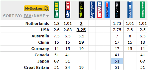解读:2008年北京奥运会上,荷兰、美国和澳大利亚队分别获得冠亚季军。去年上海游泳世锦赛,荷兰成功卫冕世锦赛冠军,伦敦奥运会上,强大的荷兰队卫冕冠军的可能性极大,唯一能与荷兰队掰手腕是的连续几届奥运会和世锦赛亚军美国队,荷兰的夺冠赔率在2.0左右,美国队赔率基本位于2.5-3.0之间。中国队在上海世锦赛上取得了第4名,不过,当时她们仅落后第3名德国队0.31秒。