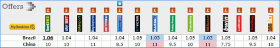 从各大公司为本场比赛开出的赔率来看,巴西胜赔都低于1.1优势过大,而中国取胜的赔率最低也高达7.75,而且从其他公司的态度来看,Bwin的超低赔率也是有诱买中国的嫌疑,本场中国爆冷希望很小。
