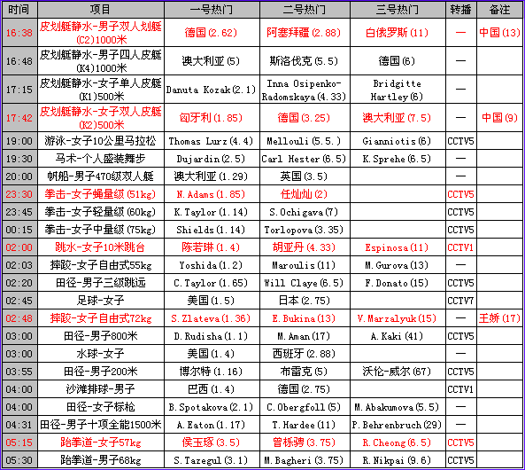 综合来看,今天中国队虽然在7个项目中拥有冲金机会。但是除了女子10米跳台十拿九稳外,也只在跆拳道女子57kg级和拳击女子51kg级两个项目上拥有较大的夺金把握。单日拿下2-4金是比较合理的目标。(从前从前(微博))