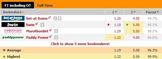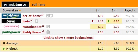 本场比赛主场作战的公牛大热。在上个主场输给缺少状元戴维斯的黄蜂后,全队卯足了劲,势必在这场挽回面子。博彩公司为主胜开出的赔率都低于1.20,平均赔率仅为1.15,转化成赢球概率达到88%,公牛主场获胜明显得到博彩公司的追捧。不过bwin的开出的赔率较为异常,主胜和主负赔率明显低于其他博彩公司。让分方面,主让9.5分对于公牛来说可能有点吃力,除了上赛季主场26分狂胜对手外,近两个赛季公牛虽然都赢球了,但分差都在10分之内,本场比赛公牛让分过高恐输盘。大小分方面预设分数为187.5,以公牛的防守力度,本场不看好大球。