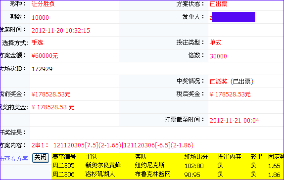 话说当今篮彩大势,各路英雄费尽心机,欲找到竞彩篮球中奖之道,可惜苦苦追寻,却未能有所奏效,虽然小奖不断,但难以满足,此时大家都在等待,等待着传说中本站神人[Z****]的再次出手,不负众望,神人重出篮彩江湖立即倍投让分胜负2串1,轻松斩获17万元。