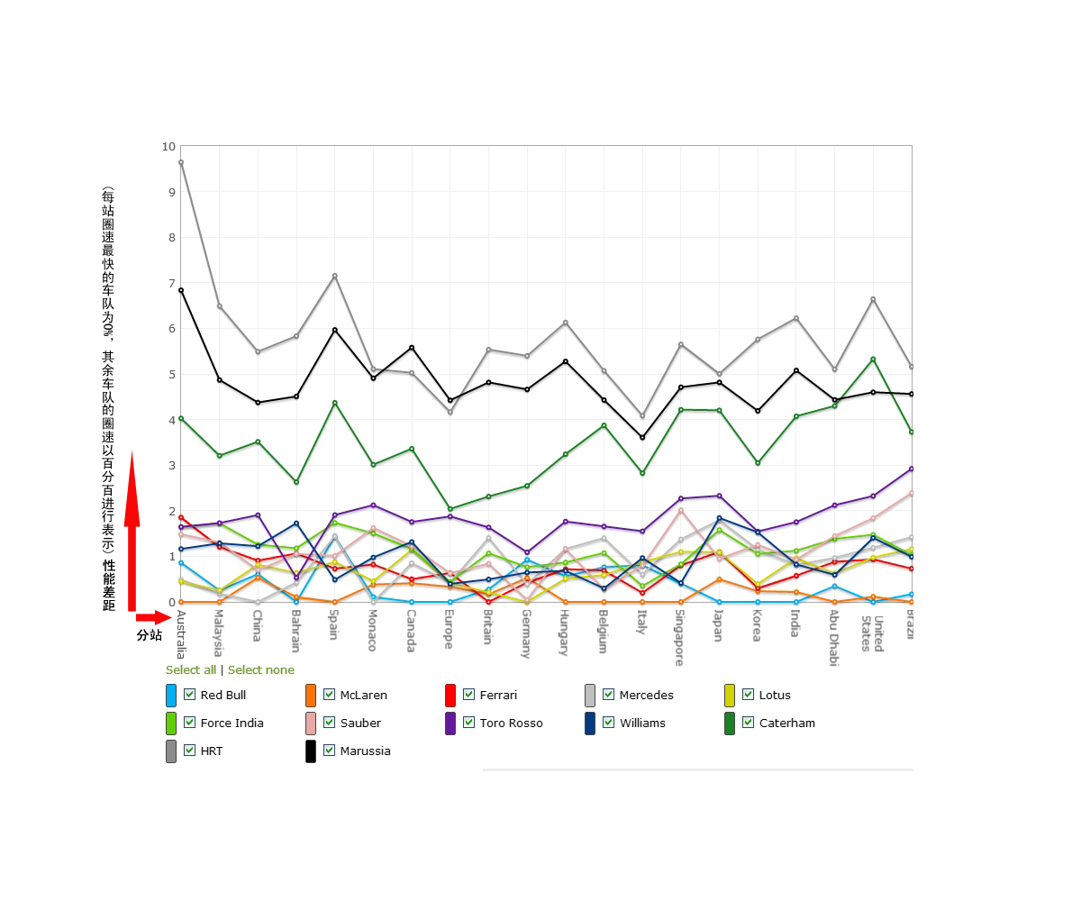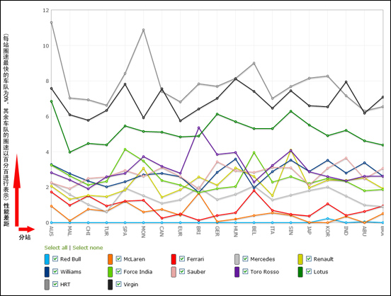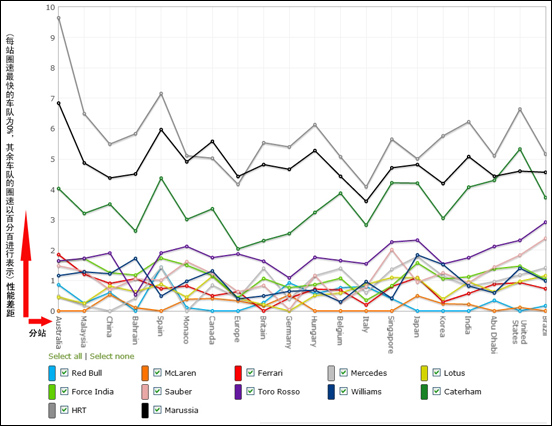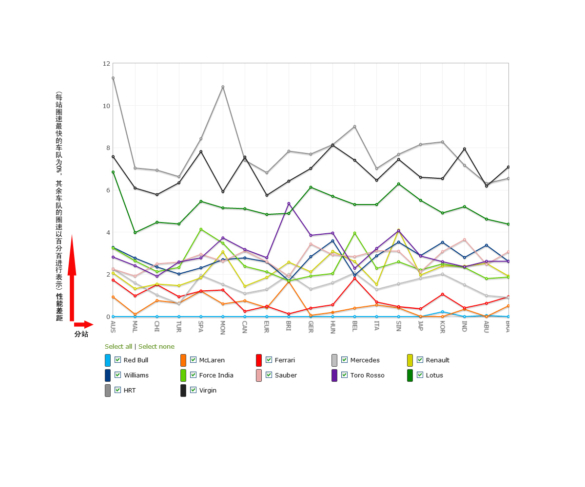 见文首,这是2012赛季12支车队在每个比赛周末所做出的最快圈速对比,展现了每支车队每一站同最快单圈创造者之间的差距【注:1)每站圈速最快的车队为0%,其余车队的圈速换算成百分比进行标位;2)这里所指最快圈速不仅限于来自正赛,还包括练习和排位,取最佳值;3)点击图片查看1200x1000的原大图】