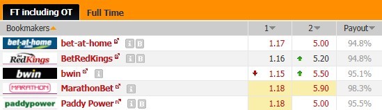 近期雷霆的状态非常出色,而且主场的往绩同样占优势,本场比赛博彩公司普遍开出的主胜赔率在1.16附近,bwin公司以1.15的最低赔力挺主队获胜,转化成主队赢球概率达到87%,相反,客胜平均赔率达到5.32,与主胜赔率拉开了较大的差距,主胜打出的空间足够,本场主胜无忧。让分胜负开出主让10.5分,上一场对阵湖人赢球输盘,本仗仍然过高,况且步行者的防守功力不容小觑,本场防止雷霆输盘。大小分预设是196.5分,虽然近10场比赛雷霆打出的分数都过百,但步行者客场场均只有86.9分,此战大分不可追捧。