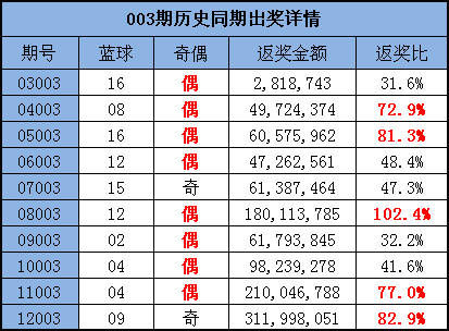 003期10年历史同期中,不仅偶数蓝球的开势火热至极,返奖比也是高的吓人:10期中,返奖比有5期超过70%,其中在2008年,返奖比更是达到了惊人的102.4%!而在近两年的003期中,返奖比也是持高不下,分别为82.9%和77.0%,如此热势,让今年003期的开出更令人期待!(爱彩·阿杜)