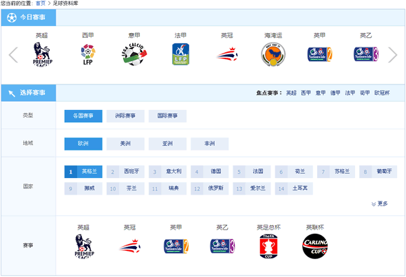 爱彩足球资料库界面简洁明了,联赛、杯赛归类清晰、一目了然。进入资料库首页通过赛事类型、地域、国家的选定,您便可轻松的找到自己需要查询的赛事。此外,资料库首页还特别设计了今日赛事以及焦点赛事推荐两个板块,对于您快速查询当日赛事以及主流赛事无疑非常方便。如果您需要查询丹麦超、乌克兰杯等等二级联赛、杯赛只需点击更多也可立马找到。至于每个页面右上角配备的选择赛事下拉框,更是让您可以畅通无阻的穿行于各个赛事页面。