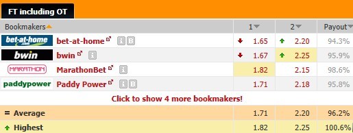 往绩上两队不分伯仲,但湖人在主场的优势较为明显,本场比赛还要考虑到一点是热火身心疲惫。欧赔方面一致看好湖人,其中bet-at-home和bwin两家公司都开出较低的胜赔,bet-at-home开出1.65的胜赔处于各大主流公司的最低位,相对前两家公司,MarathonBet公司对湖人还是较为谨慎,胜负赔相差不大,极易对玩家造成干扰。不过整体来看,湖人的状态好于对手,本场又有博彩公司的支持,推荐湖人赢球过关。让分胜负开出主让2.5分,毕竟热火的实力要强与对方,这个让分可以接受,不过湖人近几仗赢球的分差都大于这个分数,本仗赢球赢盘的希望较大。大小分预设是206.5分,两队的攻击力无需赘言,而且有科比和詹姆斯压阵,大分的赢面较大,推荐大分过关。