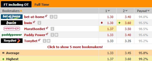 往绩上湖人优势明显,近6次交锋保持全胜,两队牌面上的实力还是有较大的差距,而取得连胜后的湖人大受博彩公司追捧,bet-at-home和bwin两家公司都为主队开出最低的1.30胜赔,略低于1.33的平均胜赔,而在负赔上,各家公司都纷纷开出高赔率,bwin后市继续上调,目前已达到众多主流公司最高的3.60,客队爆冷的机会甚微,本场看好湖人收获3连胜。让分胜负开到主让7.5分,昨天主场9分击退实力超强的雷霆,本场面对实力远远落后的黄蜂,取得10分以上的分差问题不大。大小分预设是195.5分,本赛季湖人主场场均得分为101.8分,而黄蜂客场场均得分为95.8分,本场大分可追捧。