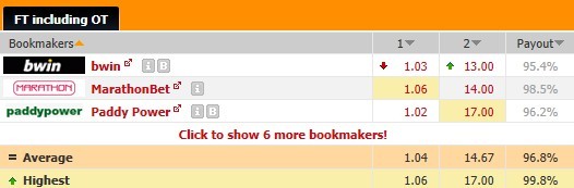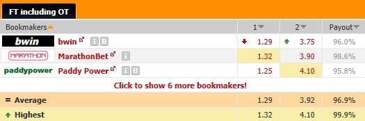 往绩上处于一面倒的局面,近10次交锋,热火赢了其中的9场,其中近5个主场保持全胜。近期两队的主客场成绩形成较大的反差,近10个主场,热火只输了一场,而近10个客场中,国王只赢了一场。欧赔方面,Paddy Power开出了最低的1.02胜赔,而bwin开出的胜赔也只有1.03,本场热火大胜几无悬念。让分胜负开到主让15.5分,国王每次做客美航球馆都大败而归,相信本场也不会例外。大小分预设值是210.5分,虽然国王成绩不佳,但进攻火力相当给力,近7场比赛有6场得分破百,至于热火就无需赘言,本场大分可捧。