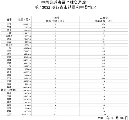 北京时间3月4日,胜负彩第13032期开奖结果揭晓:一等奖42注,每注奖金216,480元,二等奖1178注3307元,销量20,295,032元。任九场头奖16507注725元,销量18,707,268元。[买足彩2元中500万 新用户充20送10元]