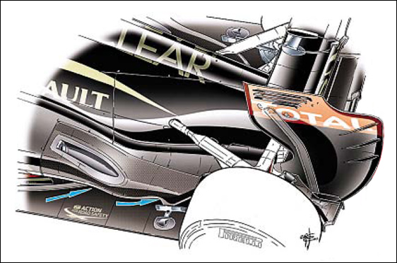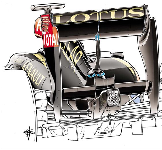 去年,随着康达效应的排气管设计率先在迈凯轮的赛车上出现后,这种设计很快便成为了围场中的标准设计。尽管包括路特斯在内的多支车队直到赛季晚期才能在正赛中配备该设计、而且远未达到最优化设置、并且这种结构的排气管布局会导致很大的动力牺牲;但是当路特斯真正投入使用时便发现,它立即带来了性能的提升。