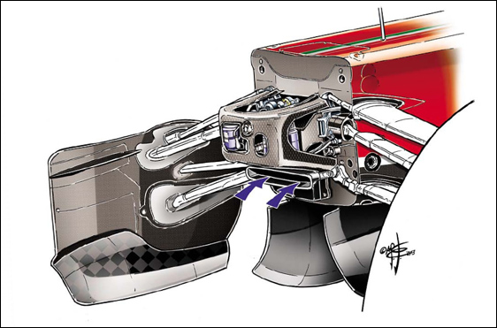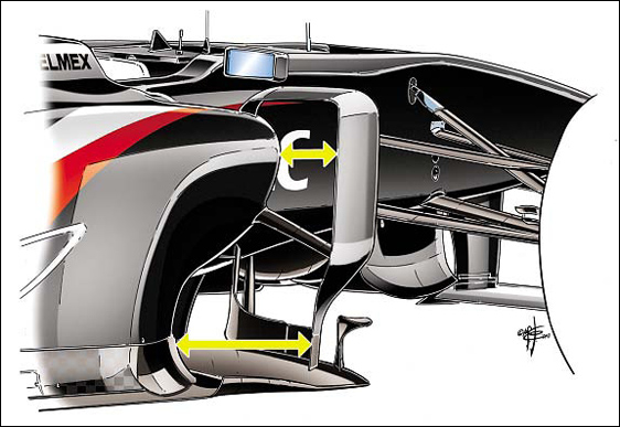 此外,新版的侧箱比起旧版,往后下沉的更加剧烈,这使得内部的结点(箭头2)明显的突出于机盖。引导槽和侧箱箱体这两方面的改进,往后汇聚侵入车尾可乐瓶区域的下方。这种修改预示着由废气制造的下压力量的增加,但是可能以牺牲可乐瓶区域为代价。