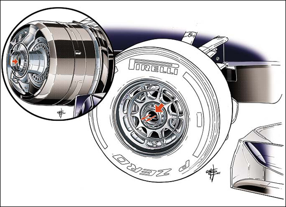 如图,威廉姆斯FW35赛车的前轴采用了中空的设计。它用于将前轮内侧气流通过轴心“泵到”前轮外侧。这一设计同时提高了前轮内侧和前轮尾流的气流质量。上赛季,红牛车队曾采用过类似的设计,但是因为其为多孔设计,出风孔会随着轴心旋转因此可以被判定是可移动空气动力学套件,而被FIA禁掉了。但是威廉姆斯FW35的这个单孔是静态,所以是合法的。