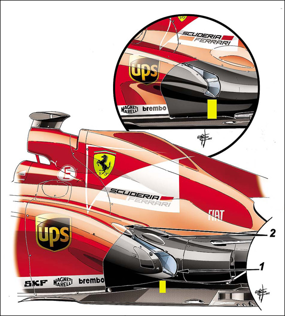将侧箱加长、尾部收的更低、以及塑造的更加有形,是为了让引擎废气与后刹车通道上的下压力套件产生效果。未来,预计法拉利亦会尾随红牛路线,在两者之间沿着底板架设一个气流管道,而不是一个敞开的开口。这将帮助把排气管的气流有效的送达目标区域,而不是让气流隔空“射击”。