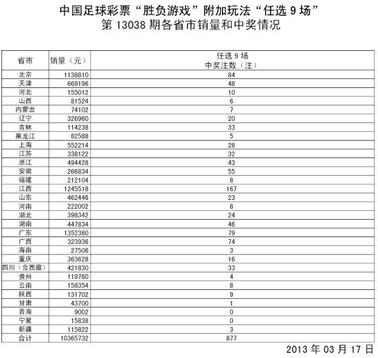 北京时间3月17日上午,胜负彩第13038期任选九场开奖,一等奖爆877注,每注奖金7564元,销量10,365,732元。投注平台方面,网友[战神时代]狂揽36注,而[北单高手]也拿下11注,共有30位网友斩获头奖。[查看过关统计]