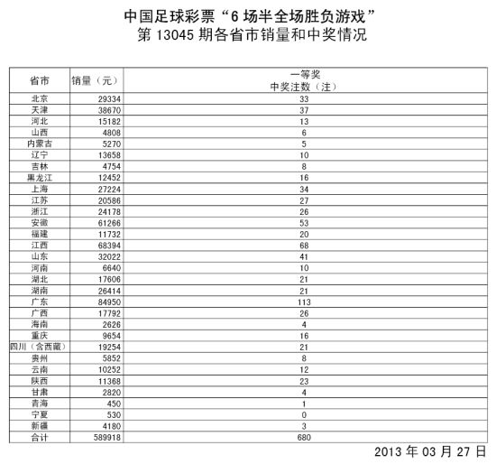 北京时间3月27日,中国足球[微博]彩票[微博]6场半全场游戏第13045期开奖结果揭晓:一等奖680注,每注奖金555元,本期投注总额589,918元。