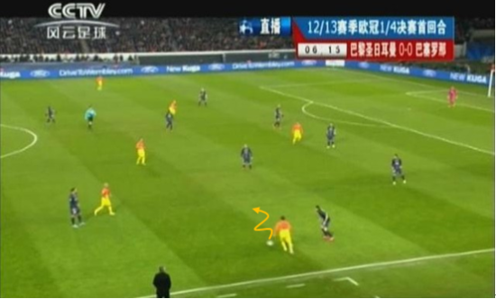 1、从图11中可以看到,梅西控球时,巴黎圣日耳曼的防守队员已经将巴萨的4、5名中前场进攻队员一对一地牢牢防死,可以说,若想从中场做穿切配合是相当困难的。