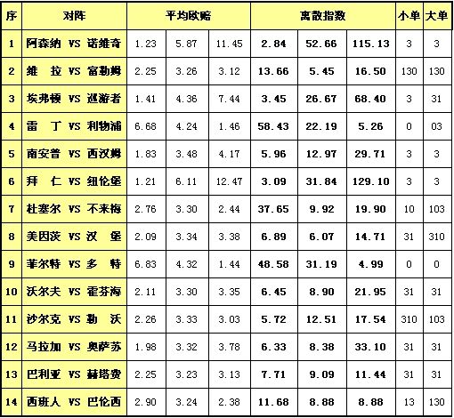 [爱彩网]胜负彩13052期离散指数:巴伦西客战堪忧
