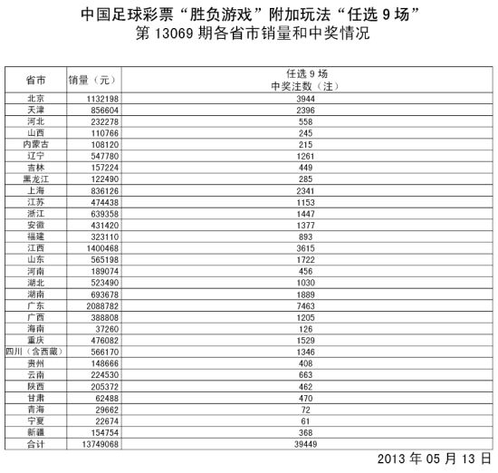 | 足彩竞猜场次胜平负任选9场统计(百分数)13069期 |