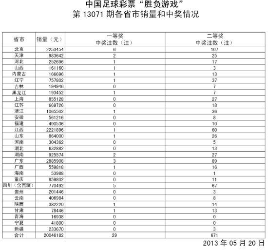 北京时间2013年5月20日,胜负彩13071期开奖结果揭晓:本期一等奖开出29注,每注奖金309,678元;二等奖中出671注,每注奖金5736元,本期投注总额20,046,182元。任九场头奖4197注仅2487元,销量16,312,490元。