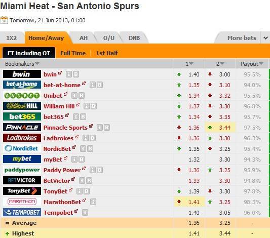 本场比赛主客队获胜的初盘均赔分别为1.32和3.24,但由于上一场与马刺拼到加时才获胜,热火主场封王的能力还是遭到了一定质疑,后市方面主队胜赔被普遍调高,而客队胜赔则有下调趋势。不过考虑到主队绝不可能浪费最后的夺冠机会,热火获胜的可能性仍大于马刺。热火此战再度让出与前一战相同的6.5分,尽管仍有高企嫌疑,但主队三巨头手感正佳,看好卫冕冠军大胜对手。两队大小分仍为190.5分,上一场在马刺方面吉诺比利和帕克手感冰凉、热火仅打出正常命中率的情况下,依旧是在常规赛时间打出190分,最后一战双方状态必将有所调整,建议继续走大分。