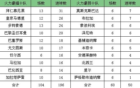 强队与弱队之间的攻击力差距明显:从参赛32支球队的攻击力排行来看,前十位的总进球数高达196个,占据总进球数的53%,后十位的总进球数则仅有50个。能够笑到最后的,基本上是火力十足的强队。夺冠的拜仁13场比赛里攻入31球排名榜首,紧随其后的是止步半决赛的皇家马德里,12场比赛打进26球。排名第三的是多特蒙德,“大黄蜂”13场比赛打入24球。