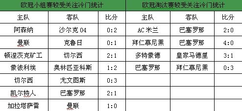 总体而言,欧冠小组赛爆冷的场次算比较少,数场较大冷门都与英超球队有关,其中比较典型的有:阿森纳主场0比2负于沙尔克04、曼联主场被克鲁日1比0击败、客场0比1输给加拉塔萨雷,以及阿贾克斯主场3比1完胜曼城、切尔西客场1比2败给顿涅茨克矿工等。