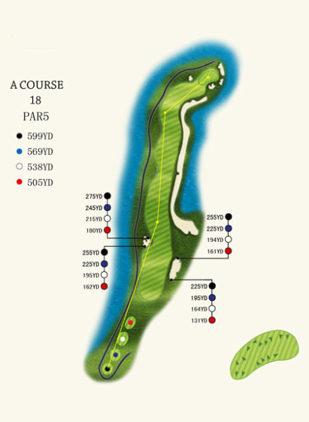 收官之洞18号洞,标准杆5杆,球道蜿蜒曲折,球道左侧的湖水,映衬远处的山丘及会所,真是美不胜收。但球道两旁分布开来的沙坑,也在警告着您不能有丝豪的失误,特别是在第二杆时一定要注意隐藏在球道右边的沙带和水。切记:没有十足的把握千万不要强攻。最好的方法就是先把球放到左侧的停球区,再以一记漂亮的铁杆把球on上去,以保PAR争鸟的策略给富有挑战性和趣味性的18个洞画上一个圆满的句号!