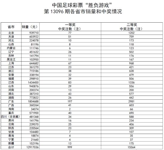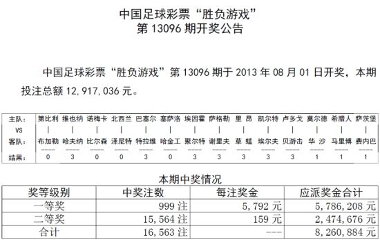 北京时间2013年8月1日,胜负彩13096期开奖结果揭晓,一等奖中出999注,每注奖金仅5792元,二等15564注159元,销量12,917,036元。任九场爆100,347注,单注奖金仅69元,销量10,853,472元。