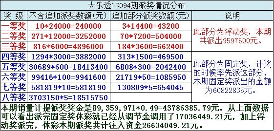 也就是说,在派完固定奖之后,体彩实际已经从调节基金及彩票发行费中支付了17036449.21元,而按照“当上一奖级单注奖金低于下一奖级单注奖金的两倍时,上一奖级单注奖金补足至下一奖级单注奖金的两倍”原则而一、二、三等奖的奖金金额应该分别为24,000元、12,000元以及6,000元,所以体彩派发的奖金还需要24,000元*10+12,000元*271注+6,000元*816注=8,388,000元(不含追加)。算上追加奖项,本期总共派奖金额是70420435元,也就是说体彩中心本期从调节基金及彩票发行费中共垫付了约26634049.21元才完成本期派奖工作。